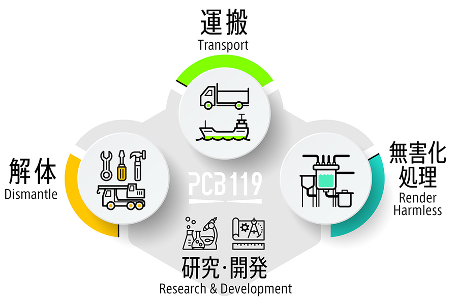 現在PCB119は上記の情報収集、研究・開発の土台に「解体」「運搬」「無害化処理処理」の3つの柱によって成り立っています。解体・運搬分野では日本全国で許可を取得しているため地域にこだわらない機動力を確保し、施工計画や安全対策・行政への対応などの煩雑な手続きも豊富な実績から一貫しての対応が可能です。処理分野では自社開発の分解技術を持って、民間企業では未踏の領域である高濃度PCB処理施設を開設予定です。(※千葉県認可申請中)これによって解体・運搬から最終処分までを担う「国内で唯一のPCB総合処理企業」としての確立を目指しています。